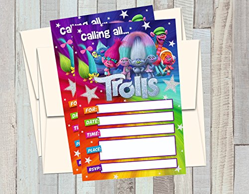 12 TROLLS Birthday Invitations (12 5x7in Cards, 12 matching white envelopes)