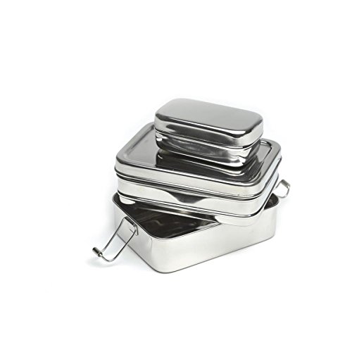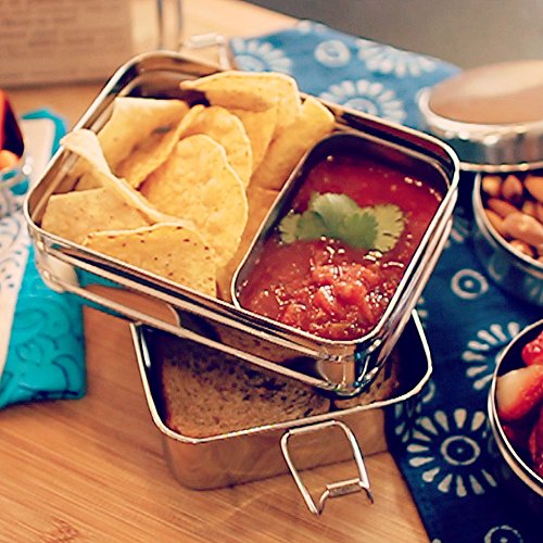 The 100% stainless steel lunchbox set works great for packing a small sandwich on the bottom plus a wet and dry side dish in the top container.