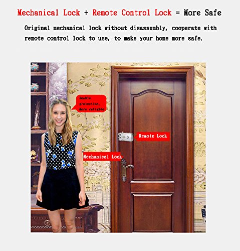 -. Feature : Lock catch and lock whistle are in a upper and lower combine state, and linking the door with door frame tightly by lock and lock catch to form a space without keyhole and crack / DC Hole: There is a DC hole in the lock body which can be connecting alternating current by an USB changer. When the user goes out for a long time, and don't worry it without of power / Stable Power Supply: The lock is supplied by 2 AA batteries, which can be used for 6-8 months, it will be warning by light and sound when the power is low(battery not included)) / It can be increase and decrease remote keys by using a slim iron stick to click the hole / Emergency Lock Hole: When there is an emergency, the user can't open the door, he can a small hole in the corresponding position in the door, then using one sharp stick to slid up the lock until the whistle down