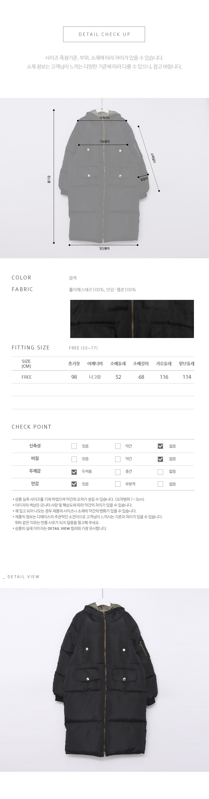디테일이 많지 않은 심플한 무드로 웰론 충전재를 많이 넣어 보온성이 뛰어나면서도 가벼워 오리털 못지않은 롱 패딩이랍니다^^ 안감 컬러를 카키 배색 컬러로 넣어 밋밋하지 않고 오픈해서 입어도 멋스러워요! 모자 사이즈도 과하게 크지 않고 헤비 한 털이 달려있지 않아 심플하면서 매일 입기 좋은 아이템이에요. 색상은 블랙 사이즈는 FREE 55~77 ▼ 관련상품 : 텍스처 롱 후드 원피스