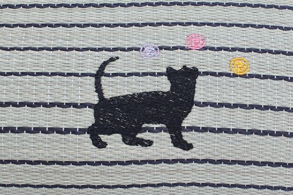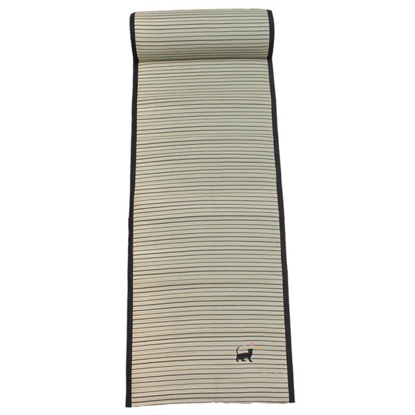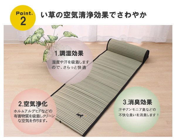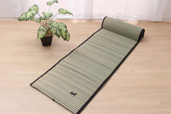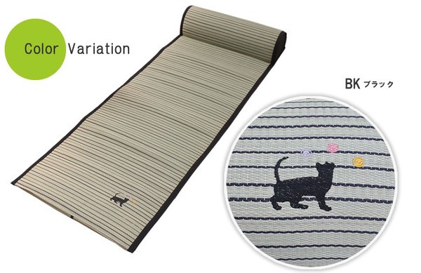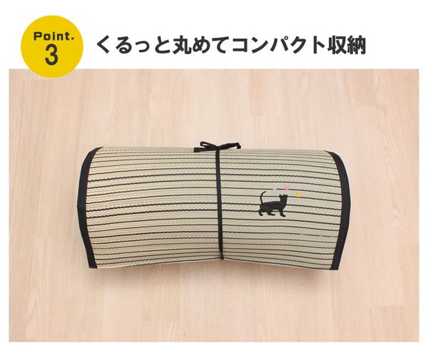 かわいいネコの刺繍を施した、い草のごろ寝マットです。丸めて紐で結ぶことでコンパクトに収納できます。お仕事のちょっとした休憩時間の仮眠にもちょうどいい商品です。生地はメセキ織りと呼ばれる織りを採用し、柔らかくサラッとした肌触りに仕上げました。い草には1.綿の約2.5倍の吸湿性があり汗のじめじめを軽減します。2.湿度の調整作用があり、蒸れにくく快適な就寝を促します。3.汗のにおいの元となる化学物質を90%以上抑え、においを軽減します。などの効果があります。中材にはウレタン15mmを使用していますので程良い弾力性があります。イ草表面に青森ヒバ加工を施しています(抗菌・防臭効果)。青森県のヒバの木から抽出した「ヒバ油」をメーカー独自の技術で材料や商品に加工しました。「ヒバ油」には、ヒノキチオールという天然物質としては極めて抗菌性の高い成分が含まれ、医療や食品など多分野で利用研究が進められています。※自然素材であること、また職人が一つ一つ手作業にて加工を行うため、形状のバラつきや表示サイズと多少異なることがあります。ご了承下さい。