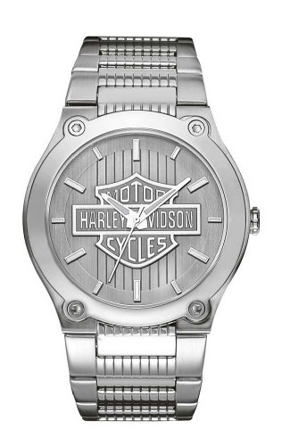 Harley-Davidson® Bulova® Men's Watch. Silver patterned dial. Large H-D® raised Logo. Luminous hands and markers. Stainless steel case and bracelet. Fold-over buckle/safety clasp with lock. Water resistant to 165 ft. 76A134