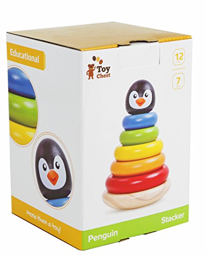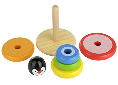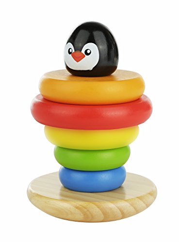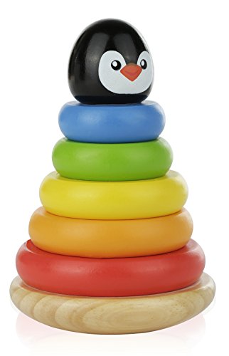 Children will love this classic wooden ring stacking toy, now with an adorable penguin design. Five colorful all-natural solid wood rings in red, orange, yellow, green and blue can be placed on the solid wood peg base, topped with a cheerful penguin topper. The base is curved to provide stimulating rocking movement.