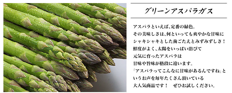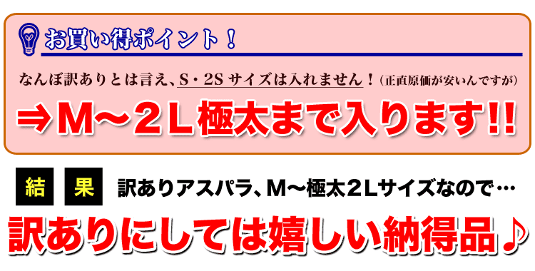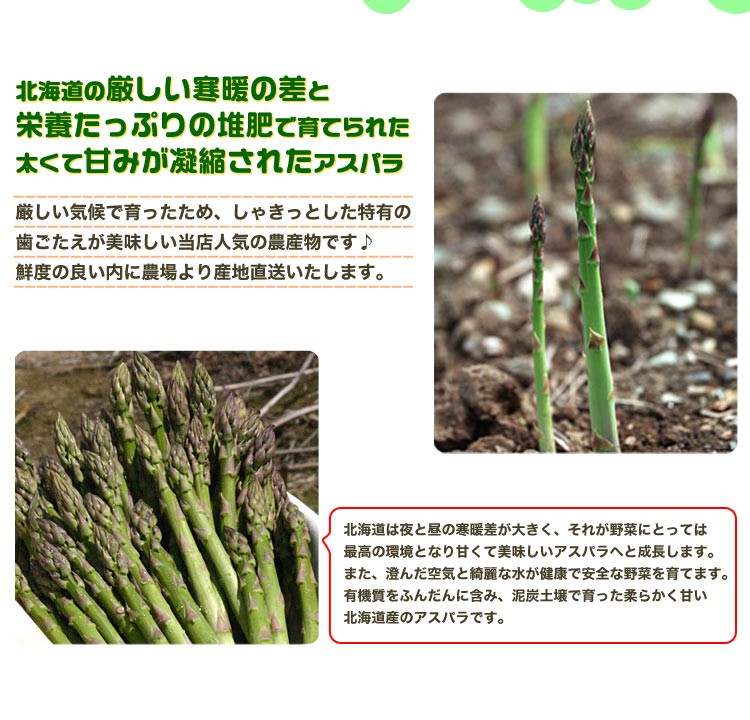 ≪クーポン発行中≫2個ご注文で1,000円OFF(1個あたり500円OFF)クーポン有効期間は発行から10~15日ですクーポン有効期間中は1ユーザー2回(2枚)のみご利用可能ですクーポン適応は一度のご注文に2個ご注文の場合に適応されます ―――――――――――――――――――――――――――(2個以上ご注文は1箱におまとめ発送する場合がございます)▼早いがトクトク▼【超早期割引★2,380円】2018年1月17日(火)~4月30日(月)AM9:59まで【早期割引★2,480円】2018年4月30日(月)AM10:00~5月10日(木)AM9:59まで【通常★2,580円】2018年5月10日(木)AM10:00~<内容量>■グリーンアスパラ約1kg前後(約500g前後×2個)(曲がり・変形・不揃い・傷キズ、等)(M~2Lサイズ混合)※曲がり・キズモノ・サイズ不揃い■北海道産■発送形態:冷蔵発送■お届け指定:不可■同梱:グリーンアスパラ同士のみOK■発送予定:5月下旬前後頃よりご注文順に発送
