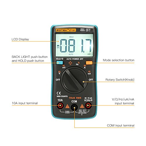 - ▲ AUTO-RANGING AND AUTO POWER OFF: 6000 counts auto-ranging digital multimeter accurately measure AC/DC voltage, current,frequency, resistance, capacitance, diode; If the meter is idle for 15 minutes (idle time), the meter automatically turns off. After auto power-off, pushing any of the push button or changing the rotary switch can turn on the meter again.