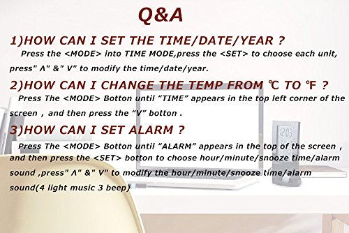 Studio : GENTHOR Publisher : GENTHOR Binding : Kitchen Product Description GENTHOR DESK CLOCK QA 1 ) HOW COULD I CHANGE THE DAY,DATE,YEAR? Press The MODE Botton into the "TIME" mode ,and then press the "SET" botton to choose date, month, day,press" Λ" " V" to set the date .month,day. 2 )HOW CAN I SET ALARM CHANGE ALARM SOUND ? Press The "MODE" Botton into ALARM mode,and then press the "SET" botton to choose (HOUR,MINUTE,SNOOZE TIME,ALARM SOUND ) ,press" Λ" " V" to set the (HOUR,MINUTE,SNOOZE TIME,ALARM SOUND ) 3 ) HOW CAN I CHANGE THE TEMP FROM ℃ TO ℉ ? Press The "MODE "Botton until "TIME" appears in the top left corner of the screen ,and then press the "V" botton 0