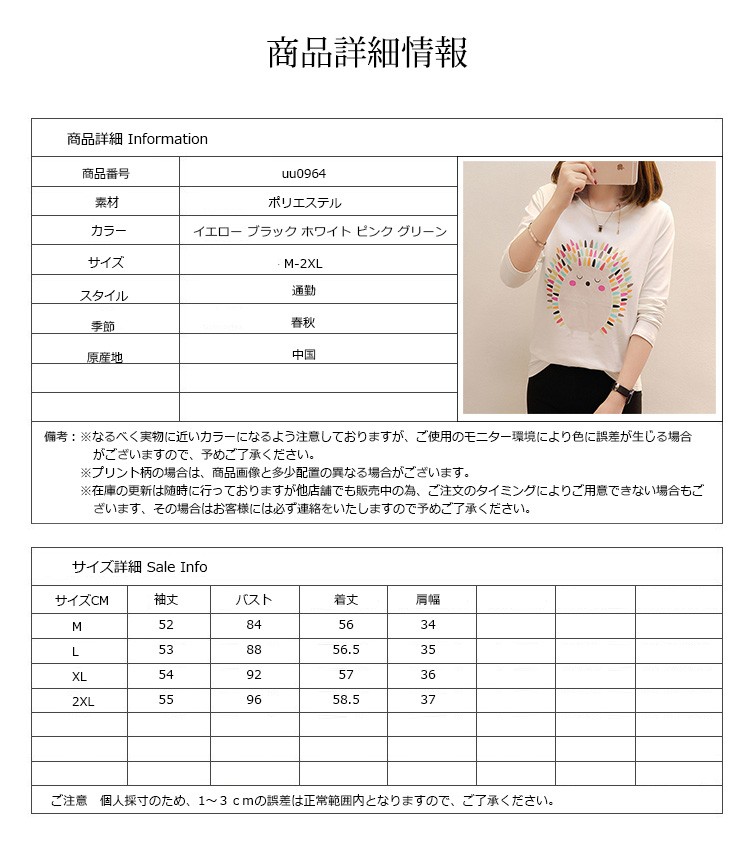 ■素材:ポリエステル■カラー:イエロー ブラック ホワイト ピンク グリーン■サイズ:M着丈56バスト84袖丈52肩幅34L着丈56.5バスト88袖丈53肩幅35XL着丈57バスト92袖丈54肩幅362XL着丈58.5バスト96袖丈55肩幅37■原産地:中国