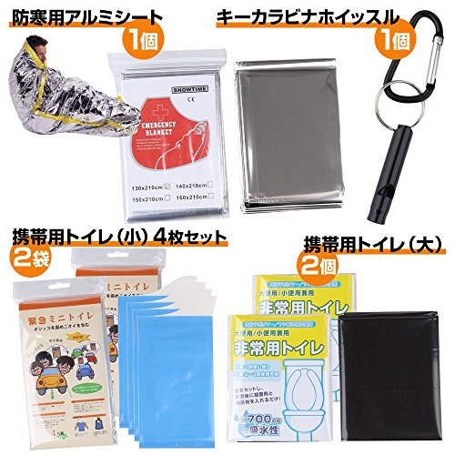 세트 내용 구급한 볼일 가방,휴대용 화장실(소)4 매세트×2 포,휴대용 화장실(대)×2개,방한용 알루미늄 씨트×1개,키 카라비너 whistle×1개,회중전등×1개,차용해머×1개