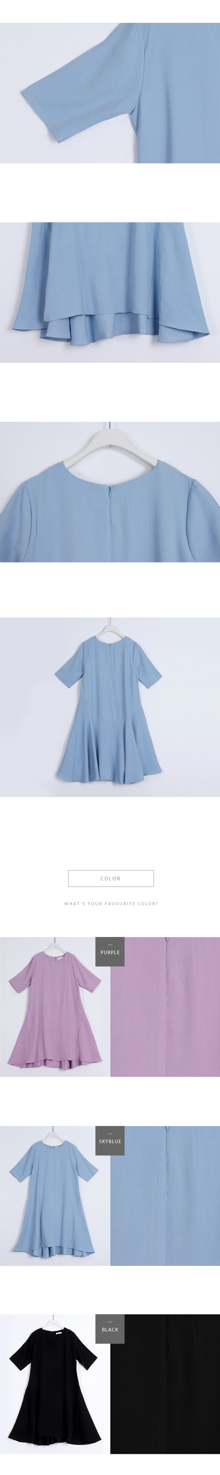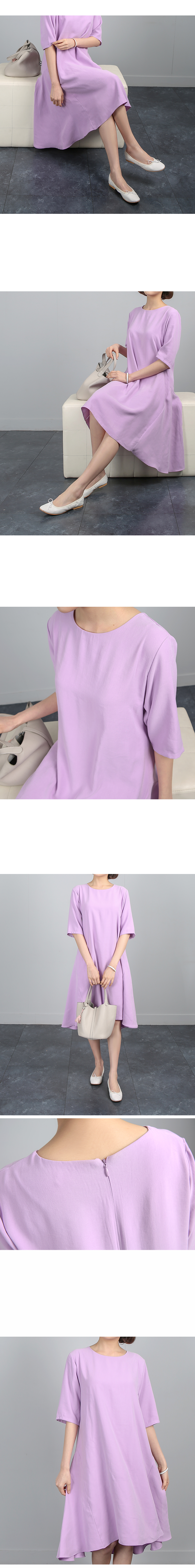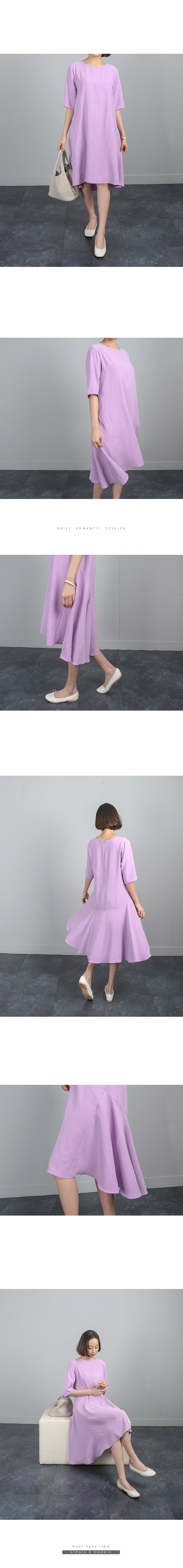 잘맞는 네추럴핏의 어깨선은 5부소매로 반듯하게 디자인되어있고 여유있게 떨어지는 바디라인은 밑단으로 갈수록 플레어 라인이 살아나는 A 라인 핏의 원피스에요 레이온특유의 저광의 소프트한 터치감이 고급스러운 소재감으로 심플하면서도 디테일이 독특해 하객룩,오피스룩으로도 좋은 아이템이랍니다 앞쪽으로 사선으로 넘어오는 옆선의 디자인으로 힙선에서 둥글게 절개되는 라인이 플레어지며 앞,뒤 언발의 길이감으로 심플하면서도 독특한 디자인이 멋스러워요