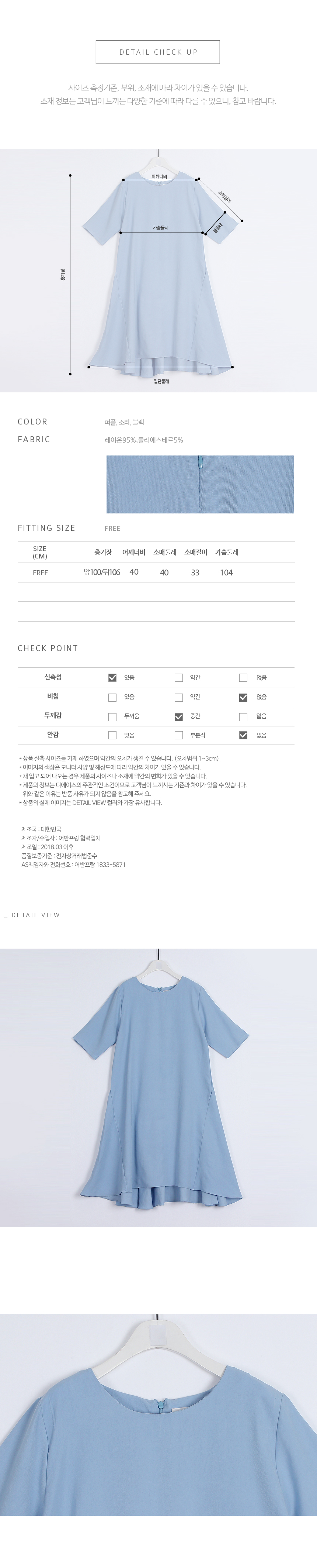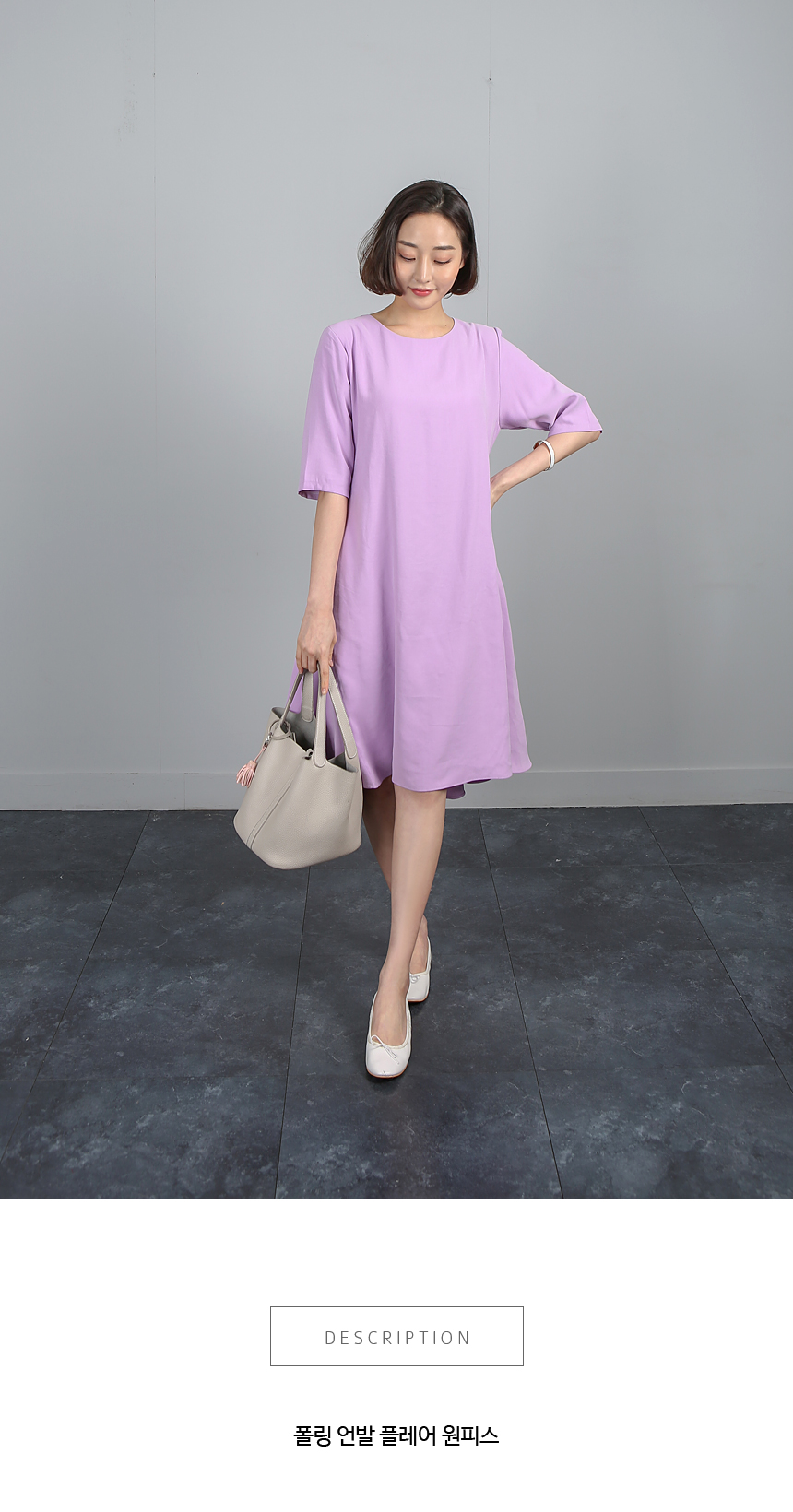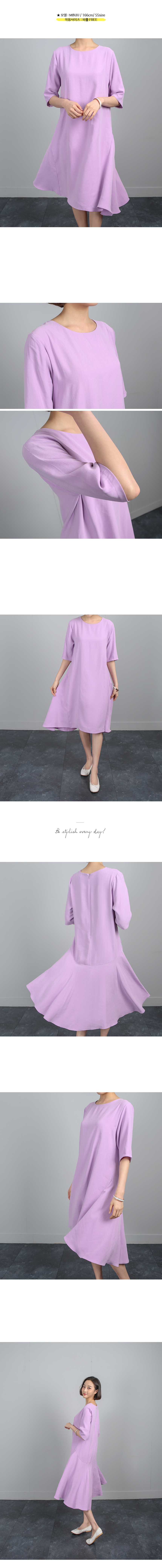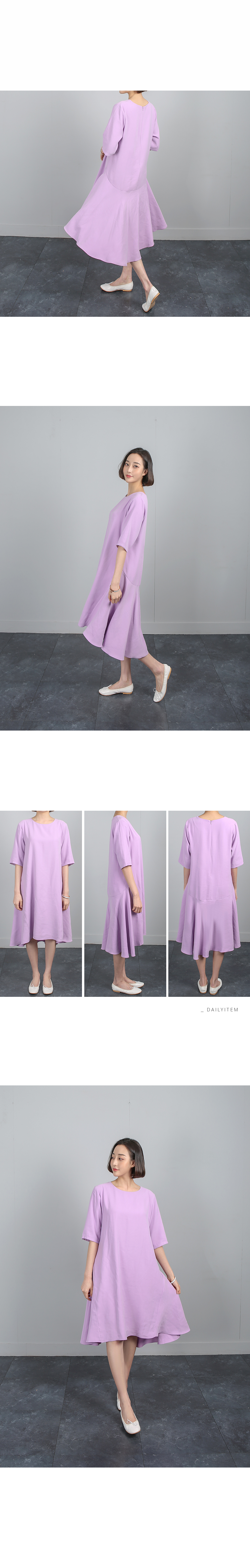 잘맞는 네추럴핏의 어깨선은 5부소매로 반듯하게 디자인되어있고 여유있게 떨어지는 바디라인은 밑단으로 갈수록 플레어 라인이 살아나는 A 라인 핏의 원피스에요 레이온특유의 저광의 소프트한 터치감이 고급스러운 소재감으로 심플하면서도 디테일이 독특해 하객룩,오피스룩으로도 좋은 아이템이랍니다 앞쪽으로 사선으로 넘어오는 옆선의 디자인으로 힙선에서 둥글게 절개되는 라인이 플레어지며 앞,뒤 언발의 길이감으로 심플하면서도 독특한 디자인이 멋스러워요