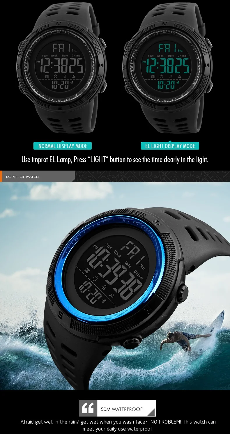 Feature:Alarm,Back Light,Water Resistant,Chronograph,Shock Resistant,Stop Watch,Complete Calendar,Auto Date,LED display