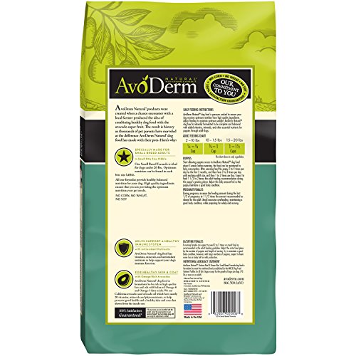 Take care of the nutritional requirements of your small-breed dog by serving AvoDerm Natural Small Breed Chicken Meal & Brown Rice Dry Dog Food. Our formula is ideal for adult dogs under 20 pounds to receive optimal nutrition with each bite sized kibble. Every bite is filled with the crucial protein, vitamins and antioxidants your small dog needs to remain energy full and active.
