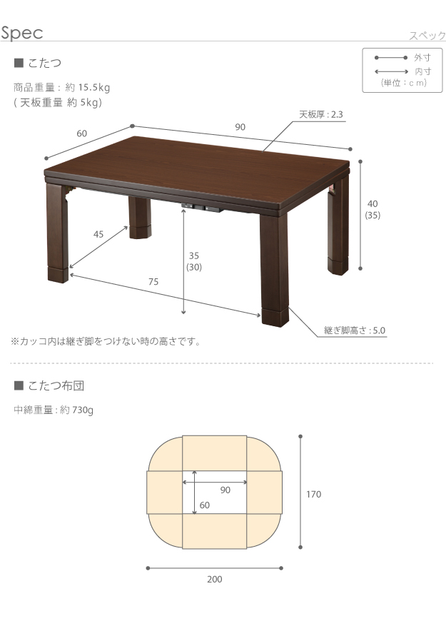 ●サイズ:こたつ-幅90x奥行60x高さ40cm(35+継ぎ脚5cm)・約15.5kg、布団-200x170cm・中綿量約730g