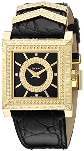 Classy and elegant, this Versace women's watch was designed to impress. Perfect for both every day and evening wear, its high levels of quality and comfort ensure your enjoyment for many years to come. Encased in gold IP stainless steel, its black dial features a Greca pattern design, 4 genuine diamond indices and the Versace logo. Shiny black leather straps with a crocodile pattern are decorated with 2 v-shaped metal inserts engraved with the Greca symbol and comfortably close with a tang buckle for safe and secure all day wear. Powered by reliable Swiss Quartz movement and water resistant to 30 meters, it is a great addition to any timepiece collection.