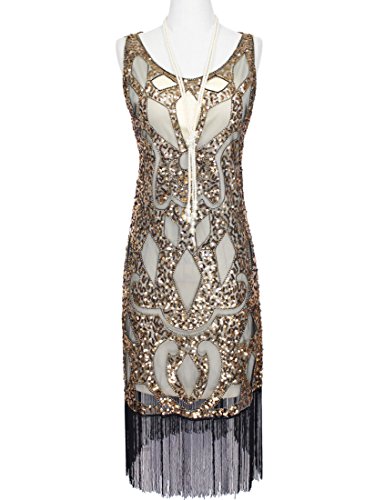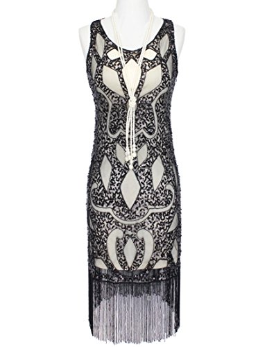 The back is as beautiful as front with sequins and beads embellishment. Cutout design to make a beaded and sequined crown pattern. Lined;Knee length dress Evening,party,wedding cocktail dress Vintage 1920s style gatsby costume dress Brand : KAYAMIYA EAN : 6996695682536