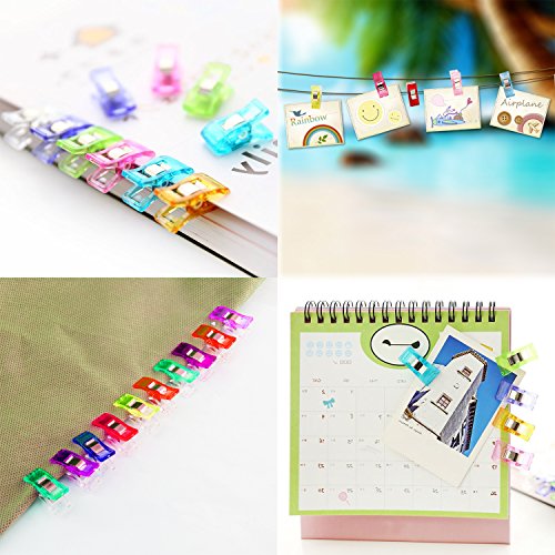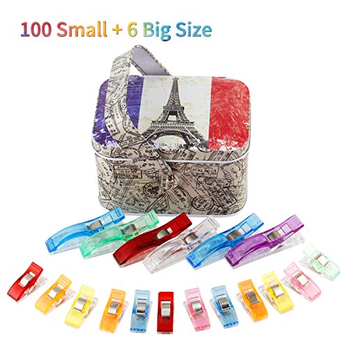 Wonder Clips, Kictero Craft Plastic Sewing Clips with Tin Box, All Purpose Craft Clips for Quilting Binding Clips, Paper Clips, Blinder Clips, Multi-Color (100 Small + 6 Large)