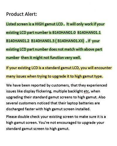 -. Title : Lenovo 04x0436 Replacement LAPTOP LCD Screen 14.0" Full-HD LED DIODE (Substitute Only. Not a ) (B140HAN01.2 HIGH GAMUT)