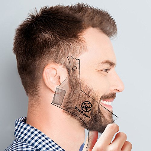 - 8-in-1 Multi-Shaping Tool – This grooming guide features a forehead line, step, straight, and curve cut, mini comb, neck line, mustache, and inward curve goatee.