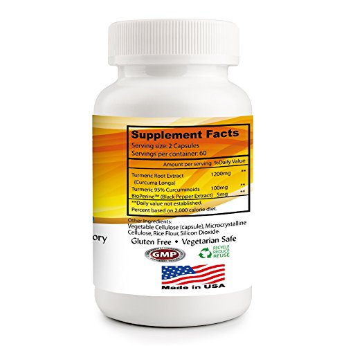 -. Feature : GET PAIN FREE - Turmeric -- Famous of supporting Joint health and relief muscle pain, helps prevent other Aches and Pains that made you away from doing the things you love. It can help you get your life back, helping with workout recovery, sports injuries, surgery recovery, blood circulation improvement, pains in the in the back and knees, and other pain management - naturally. / Turmeric spice may support the immune system and resistance to infections. Natural anti-inflammatory and powerful antioxident / BIOPERINE (black pepper extra) has been approved to enhance the health benefits of turmeric / 100% ALL NATURAL FORMULA WITH NON-GMO! No hormones, no preservatives, no artificial ingredients, no antibiotics, no gluten, no wheat, no dairy, no sugar, no starch, no yeast. / Made in USA, by FDA and cGMP certified factory. 120 veggie capsules. Take 2 capsules per day, 60 days supply.