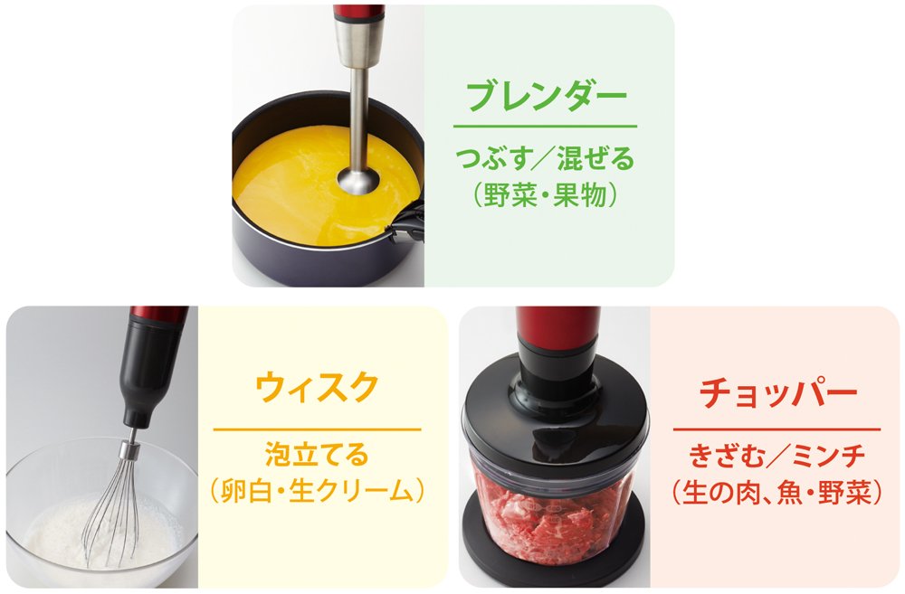 ● With three more types of attachments, it is possible to crush, mix, shred, mince and whisk.