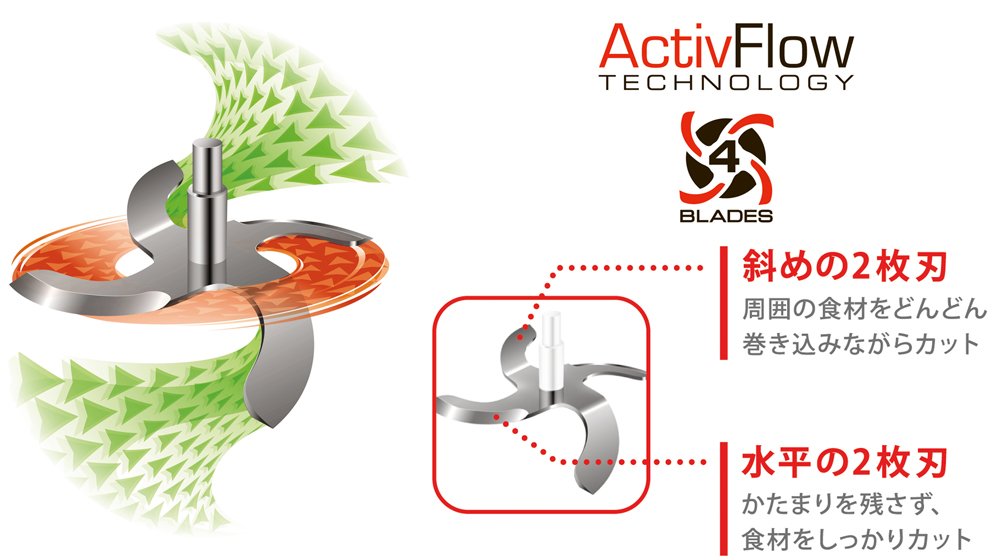 ● Active Flow Technology is a combination of two kinds of blades to cut firmly while involving fiber-rich ingredients and difficult-to-cut ingredients.