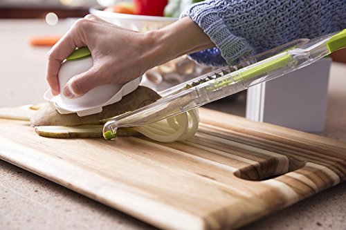 - LIGHTWEIGHT BUT STURDY mandolin. We guarantee this will be your #1 Go to kitchen gadget. The size makes this easy and convenient to hold, slice and grate on a cutting board or directly into your salad, bowl or pan.... SO MUCH EASIER TO USE THAN THOSE OTHER BULKY ONE'S that stand up.