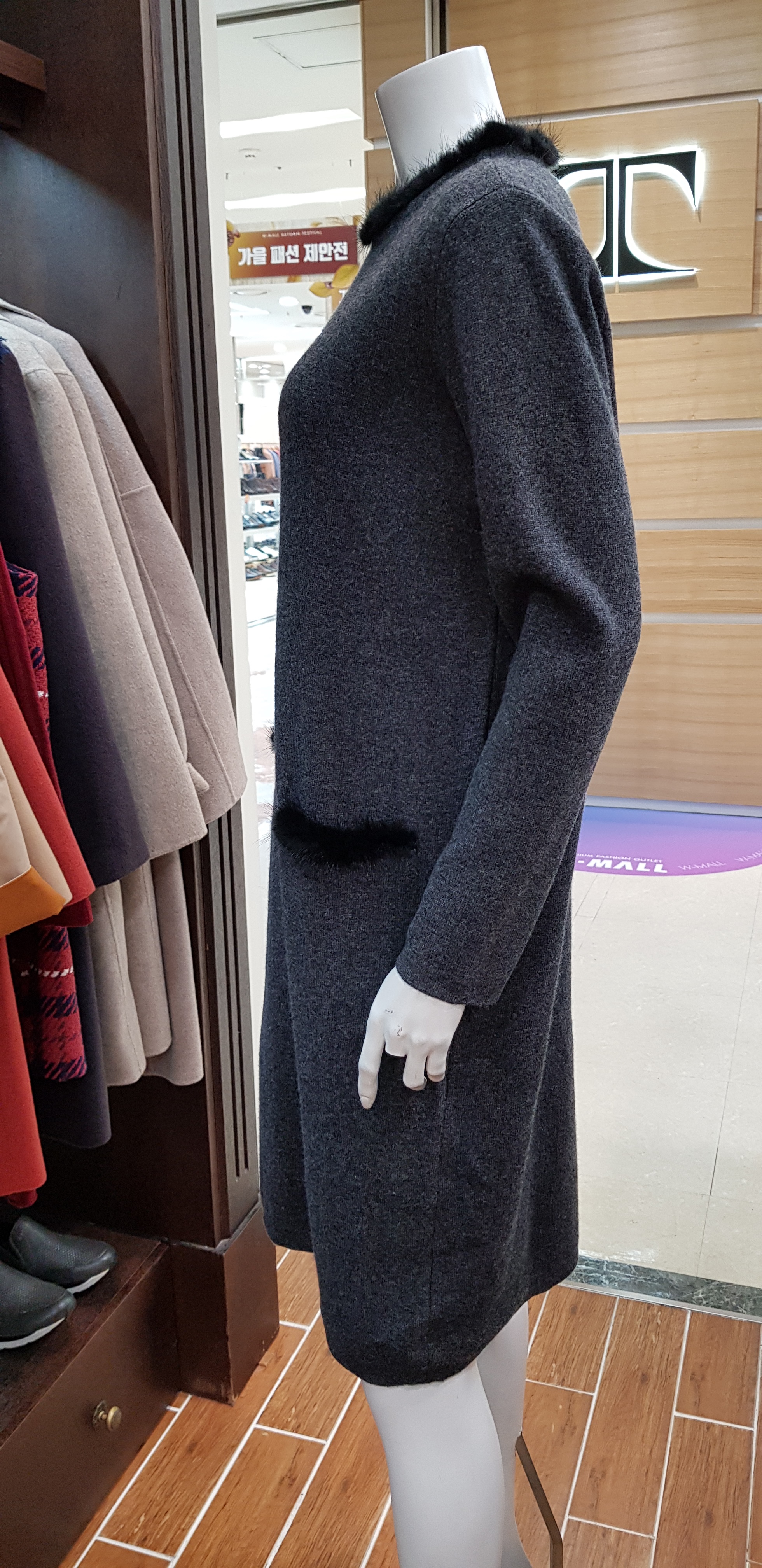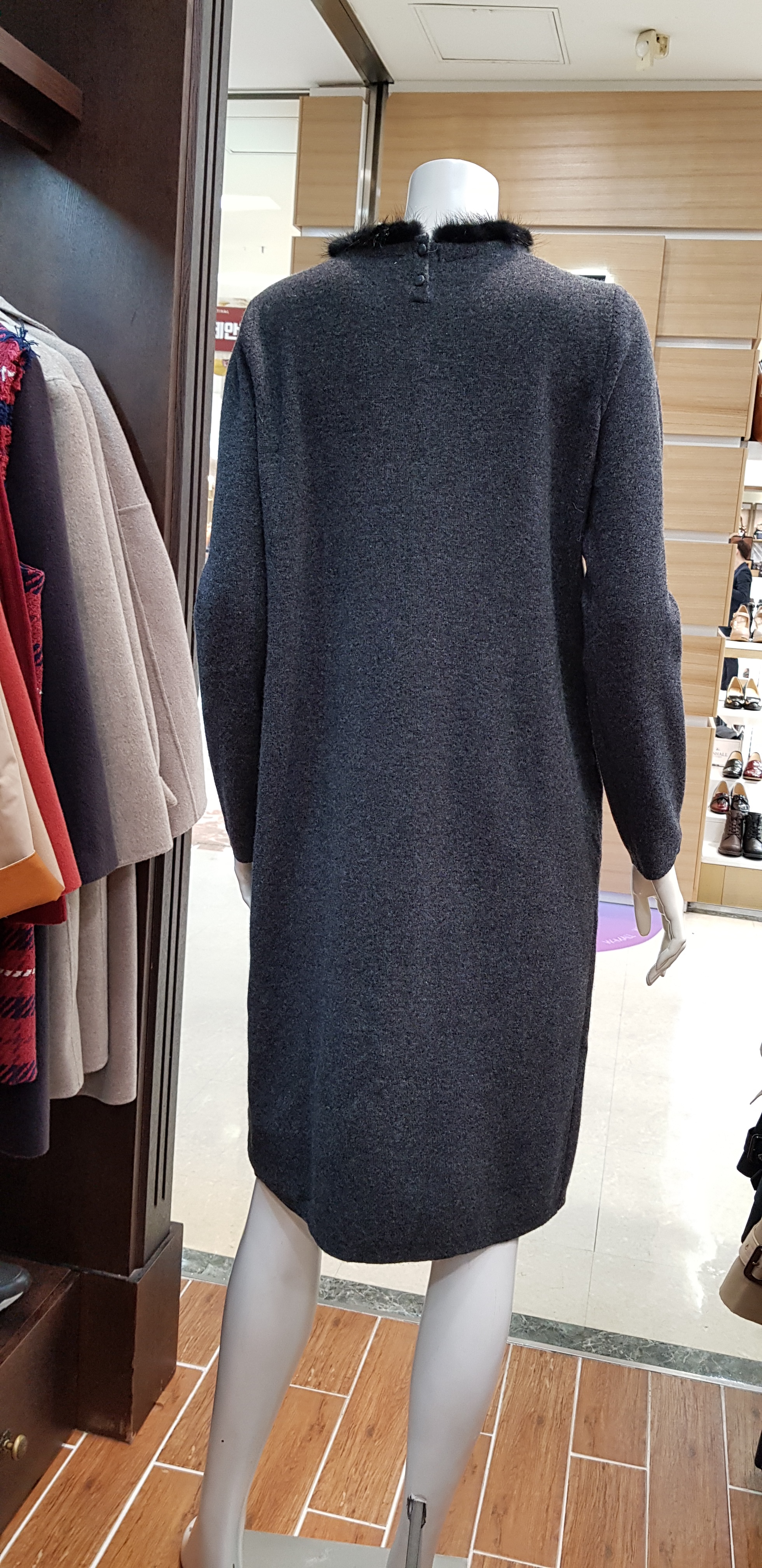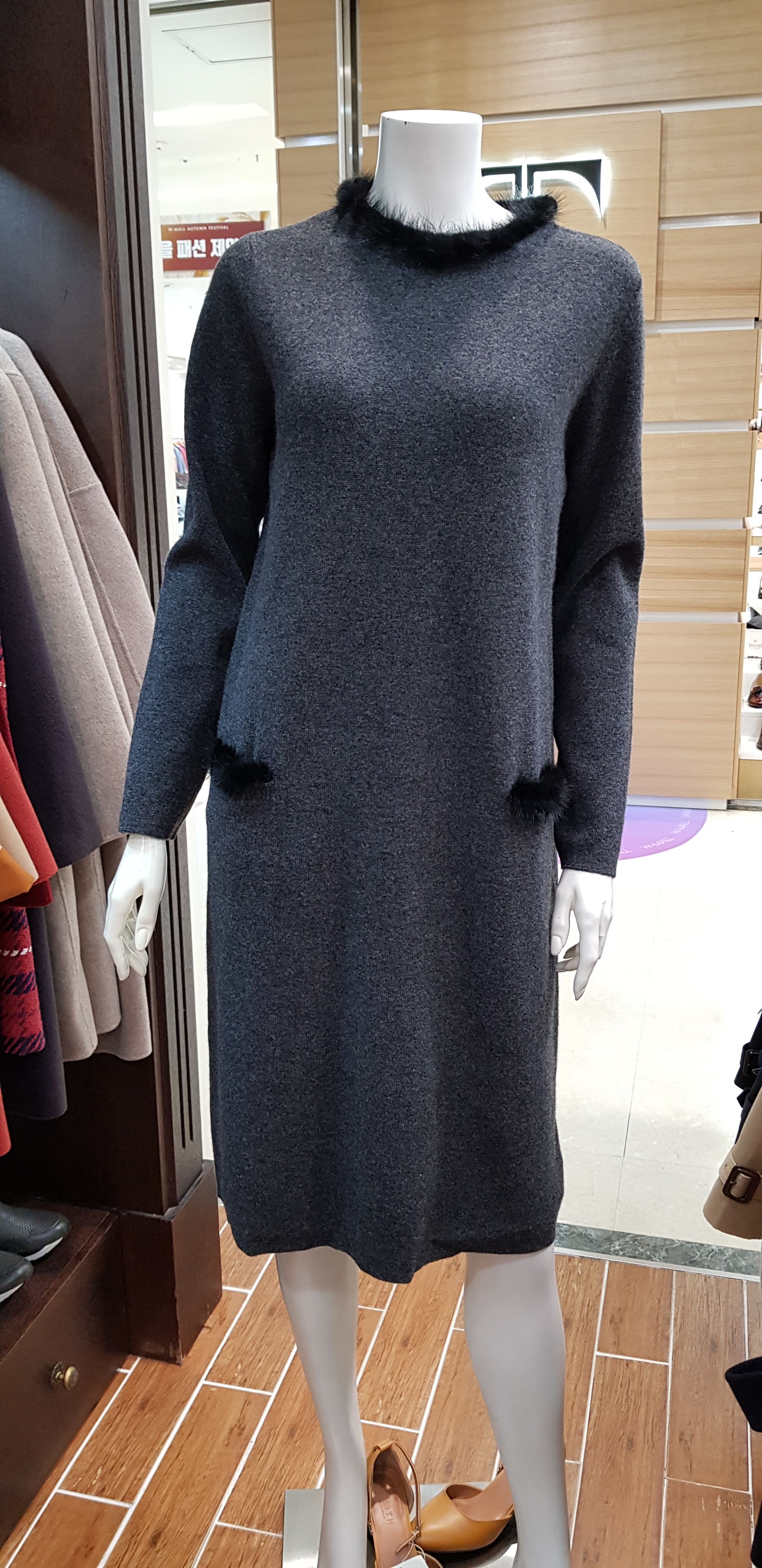 기비~박시한핏의 귀엽고 여성스런 원피스입니다 목선의 밍크장식이 포인트로 따뜻해보이고 주머니의 밍크장식도 귀여워보이는 니트원피스입니다 총장97센티입니다