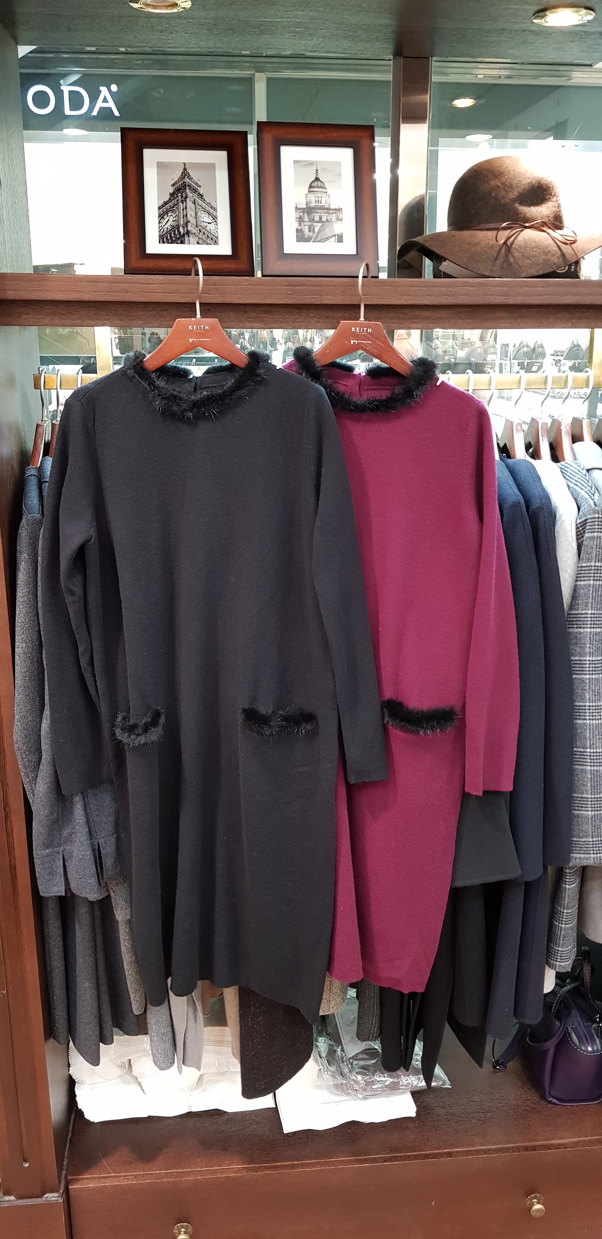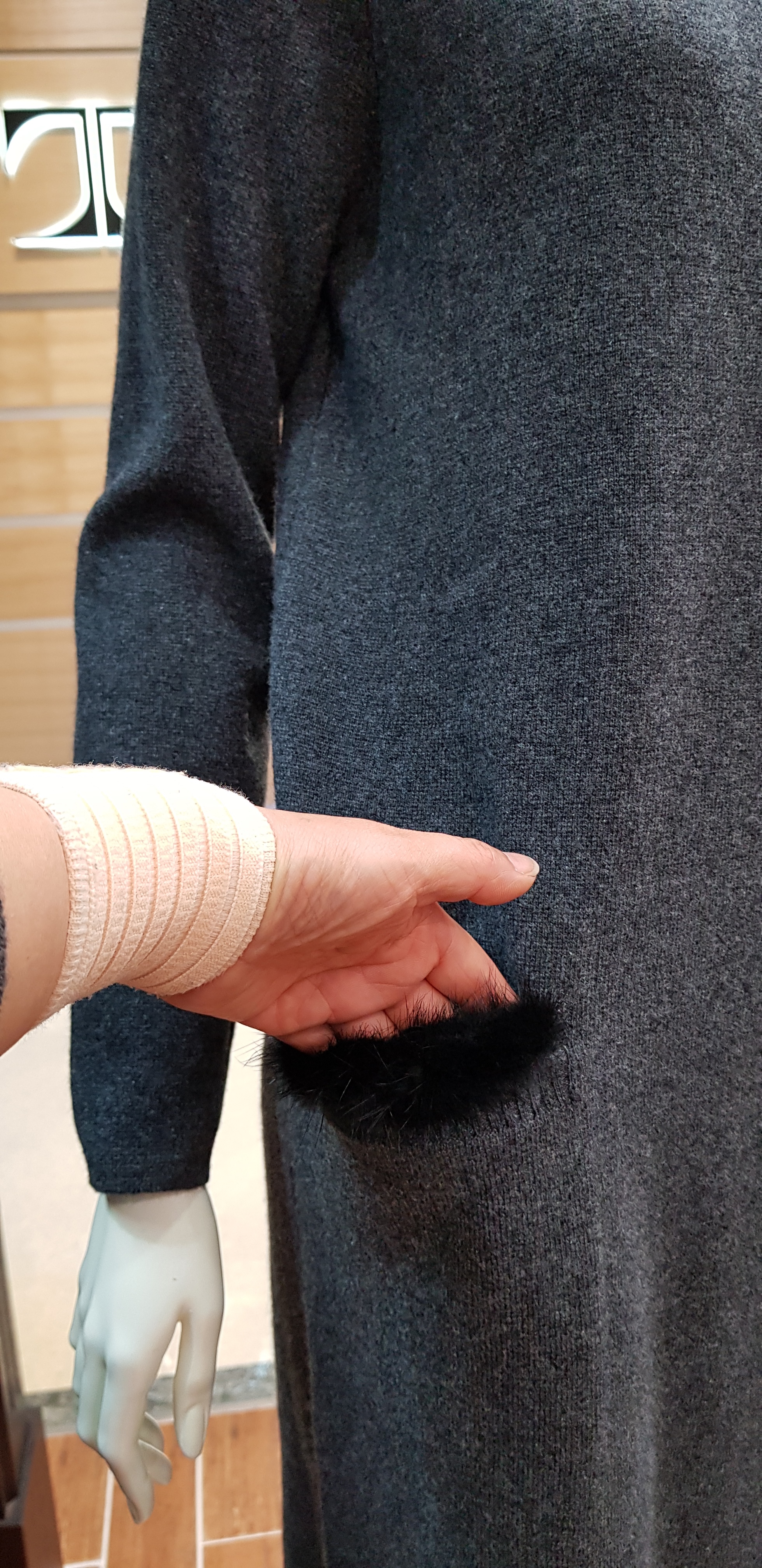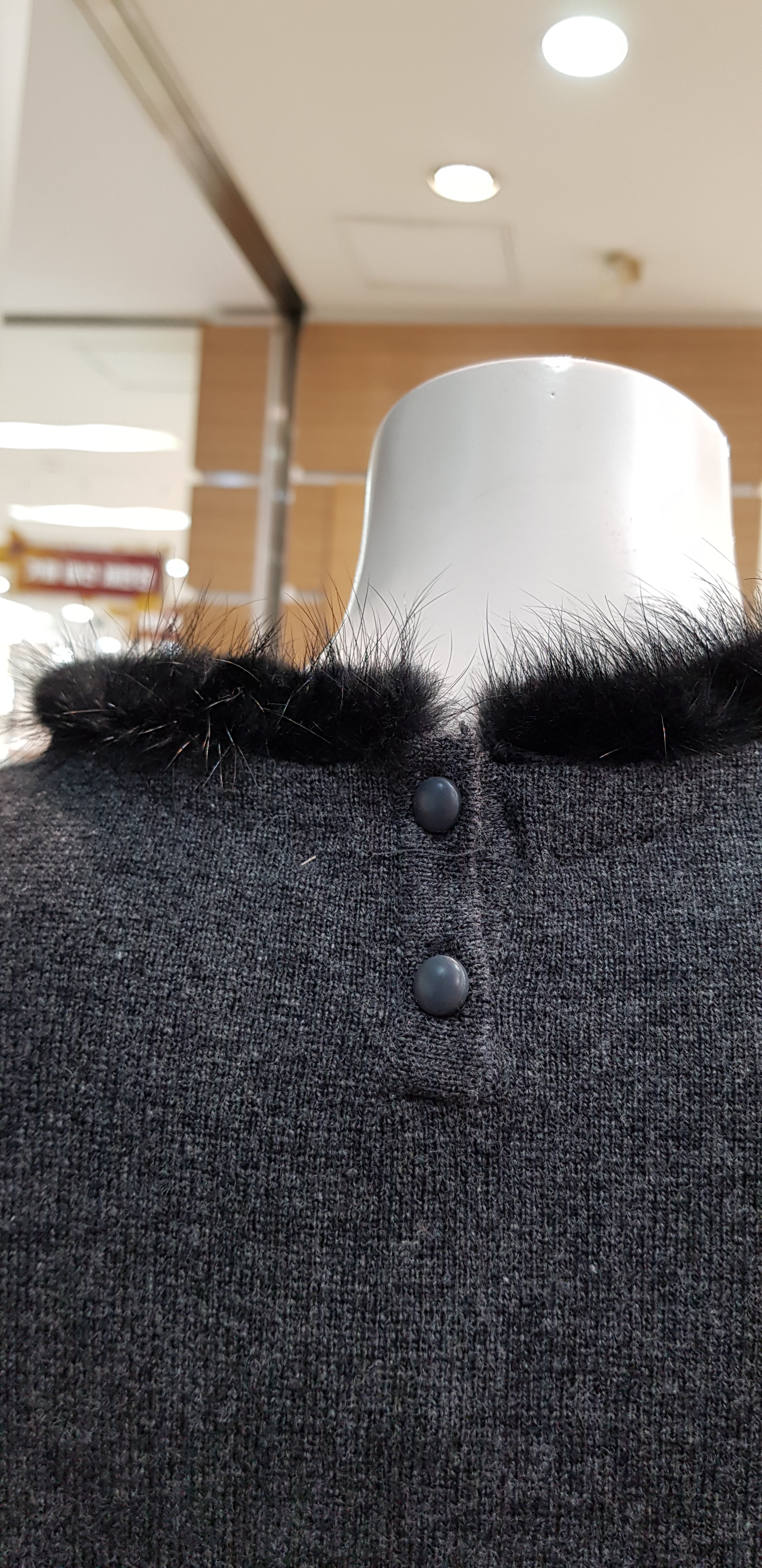 기비~박시한핏의 귀엽고 여성스런 원피스입니다 목선의 밍크장식이 포인트로 따뜻해보이고 주머니의 밍크장식도 귀여워보이는 니트원피스입니다 총장97센티입니다