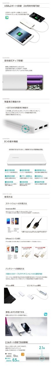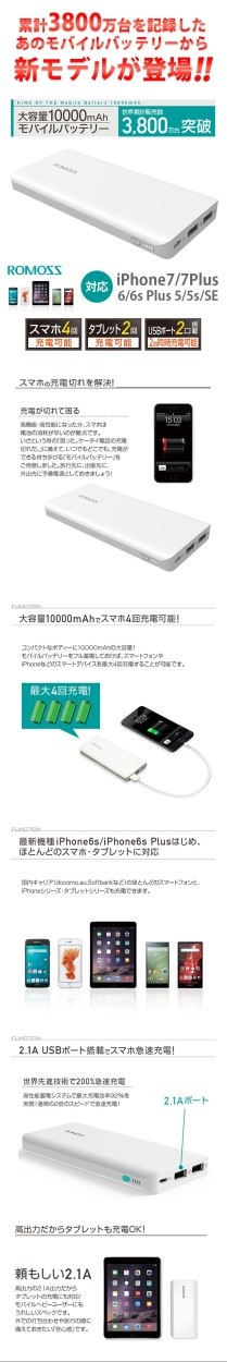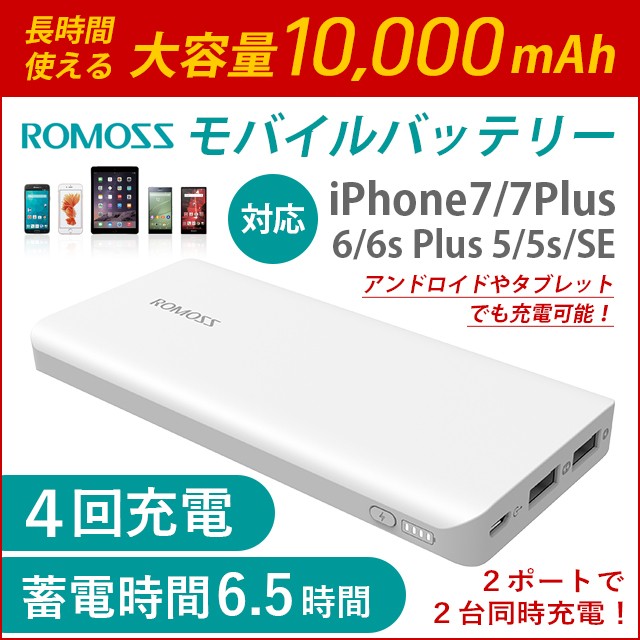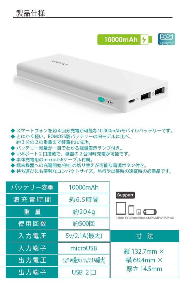 ・スマートフォンを約4回分充電が可能な10,000mAhモバイルバッテリーです。・とにかく軽い。ROMOSS製バッテリーの旧モデルに比べ約3分の2の重量まで軽量化に成功。・バッテリー残量が一目でわかる残量表示ランプ付き。・USBポート2口搭載で、機器の2台同時充電が可能です。・本体充電用のmicroUSBケーブル付属。・端末機器への充電開始/停止の切り替えが可能な電源ボタン付き。持ち運びにも便利なコンパクトサイズ。旅行や出張時の遠征時の必需品です。<バッテリー容量>10000mAh<満充電時間>約6.5時間<重量>約204g<使用回数>約500回<入力電圧>5v/2.1A(最大)<入力端子>microUSB<出力電圧>5v/1A(最大)5v/2.1A(最大)<出力端子>USB2口<寸法>縦132.7mm横68.4mm厚さ14.5mmモバイルバッテリー ROMOSS 10000mAh 【 iPhone アイフォン android アンドロイド iPhone7 2回 スマホバッテリー 充電器 携帯バッテリー スマートフォン 大容量 急速充電 全機種対応 ケーブル USBケーブル microusb quick charge 2.1a 急速 xperia iPhone5 アイホン