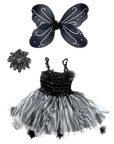 -. Binding : Toy -. Brand : Fairytale Play -. Color : black, white, zebra, hot pink -. Department : girls -. EAN : 0701722745704 -. Feature : Layers of soft tulle and feather accents make this a dreamy fairy set perfect for Halloween / The bodice is a soft satin fabric with sparkles and feathers at the top / The butterfly wings are black with shiny glitter and are sturdy for long flights through the evening. / Perfect for little girls ages 5-7 who are ready to soar / The zebra hair clip matches the dress perfectly and brings it all together -. IsAdultProduct : 0 -. ProductGroup : Toy -. ProductTypeName : TOYS_AND_GAMES -. Size : 5-7 -. Title : 3 Pc Black & White Girls Fairy Pompom Costume with Zebra Hair Clip Ages 4-6 -. UPC : 701722745704