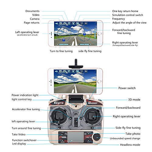 -. Feature : 2MP HD FPV Camera. Clearly record every happy moment with friends and family. / Wifi Connection with Smartphones/Laptop. Put your remote aside, fly your quadcopter with your smartphones! Enjoy FPV real-time video and image on your snartphones. / Left hand and Right hand operation. Two control mode, adapt to different operation habit. Simply exchange the operation joysticks which both right hand pilots and left hand experts can joy the entainment of flying. / Fantastic 3D Flips. Fly to about 2m, with just one push of the "Flipping Mode"button, then the drone will make a 360-degree flip to the direction you choose. / Equipped with 2 batteries, 1 battery charger, to highly enjoy your entertainment when flying.