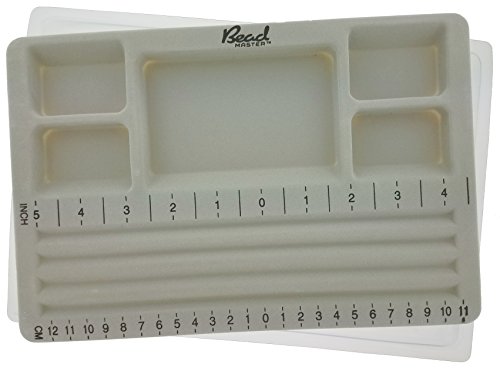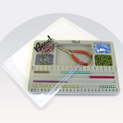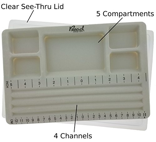 Beadmaster Traveler's Bead board with see-thru cover/lid is ideal for bracelet design on the go. It has five accessory compartments and four designing channels with inch and centimeter markings. Flocked grey plastic provides a steady designing surface and prevents beads from rolling. 7x10.5 inches.