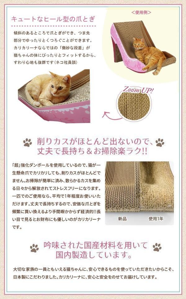 | ヒール型でインテリアとしても目を引く猫用の爪とぎソファー。傾斜のあるところで爪とぎができ、つま先部分でゆったりとくつろぐことができます。削りカスがほとんど出ない強化ダンボールを使用し、国内で製造しているので大切な家族の一員に安心してお使いいただけます。 |