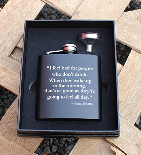 -. Brand : FunnyFlasks.com -. EAN : 0656043574321 -. Feature : Frank Sinatra Famous Quote Custom Flask Set / "I feel bad for people who don't drink. When they wake up in the morning, that's as good as they're going to feel all day." / Laser marked on one side, includes (1) Funnel and black Gift Box! / Made of Stainless steel with a Black Matte coating, When the laser marking is removed the the stainless steel underneath shows. -. Label : FunnyFlasks.com -. Manufacturer : FunnyFlasks.com -. ProductGroup : Kitchen -. ProductTypeName : KITCHEN -. Publisher : FunnyFlasks.com -. Studio : FunnyFlasks.com -. Title : Custom Engraved Flask Set Famous Quote by Frank Sinatra I Feel Bad -. UPC : 656043574321
