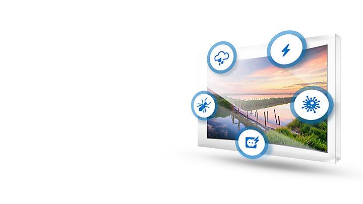 Anti Petir: melindungin komponen TV dan meredam sambaran petir hingga 8 KV dalam waktu paling lama 1 detik. Anti Lonjakan Listrik: menahan naik-turun arus listrik hanya sampai dengan 100-270 V, Anti Kelembaban: Temperatur 60°, Humid 90%, Anti Debu & Anti serangga: desain TV dengan sedikit baut dan lubang ventilasi yang sangat kecil.