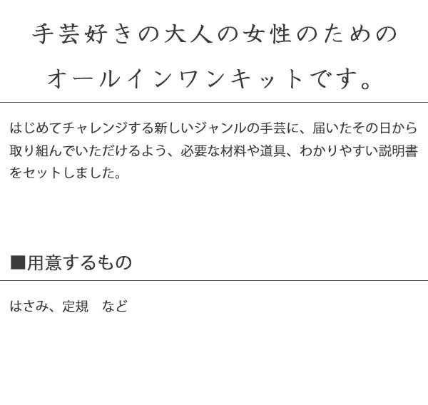 はじめてチャレンジする新しいジャンルの手芸に、届いたその日から取り組んでいただけるよう、必要な材料や道具、わかりやすい説明書をセットしました。初心者の方にもおすすめです。 |