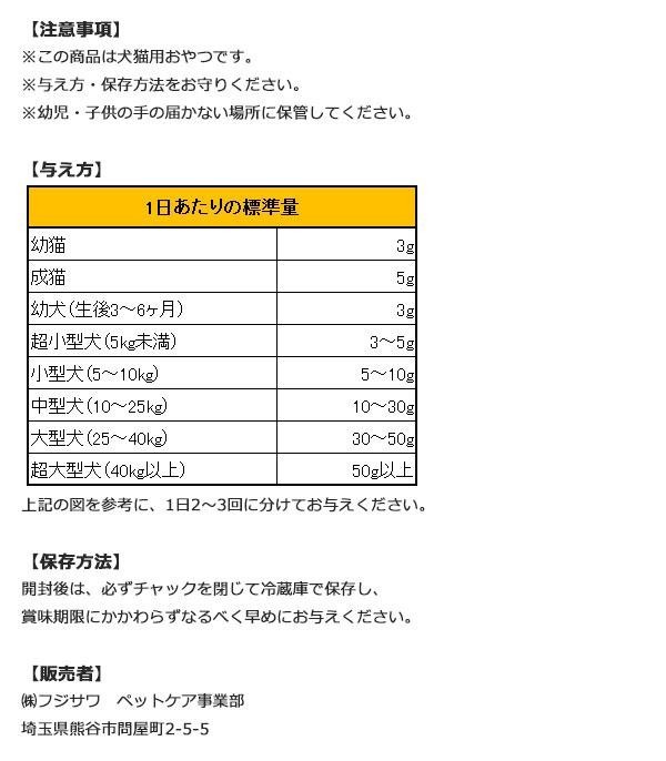 | 仕様 | 名称:犬猫用にぼし 保存方法:常温 販売者:(株)フジサワ ペットケア事業部 賞味期間:製造日より360日 |
