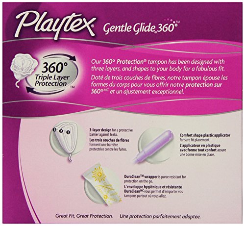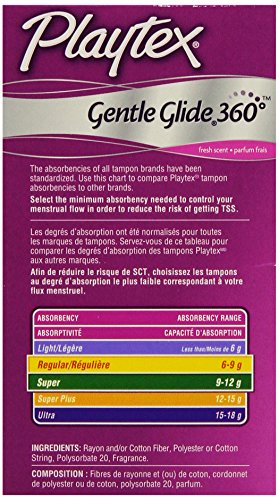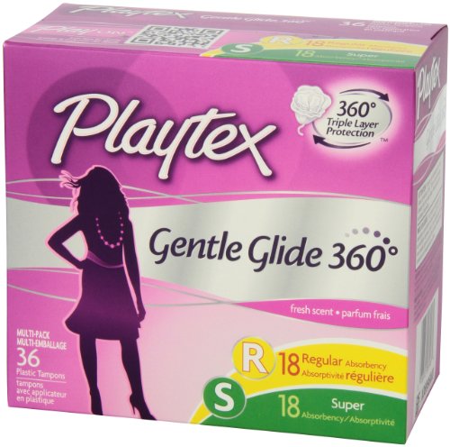 Playtex Gentle Glide Plastic Deodorant Tampons Multi pack (18 regular absorbancy and 18 super absorbancy) Exclusive cross-pad design expands to custom fit your body for incredible comfort and protection with both Regular and Super absorbancy. fresh scentFeature