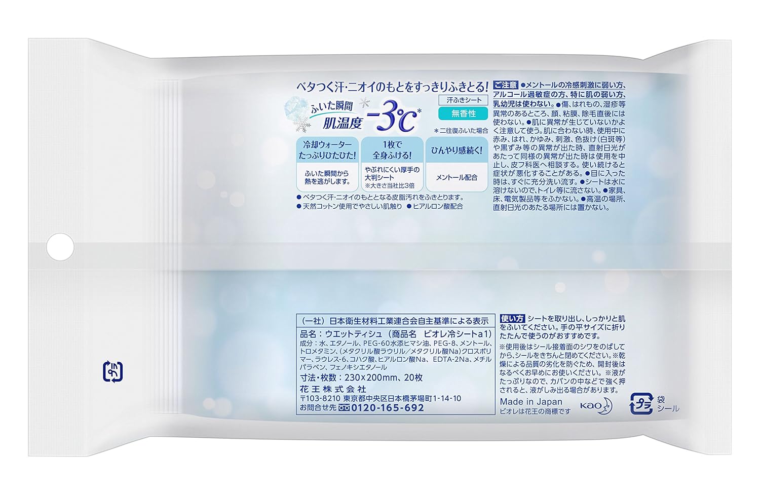 内容量:20枚 全成分:水、エタノール、PEG-60水添ヒマシ油、PEG-8、メントール、 トロメタミン、(メタクリル酸ラウリル/メタクリル酸Na)クロスポリ マー、ラウレス-6、コハク酸、ヒアルロン酸Na、EDTA-2Na、メチル パラベン、フェノキシエタノール スキンタイプ:全肌質対応