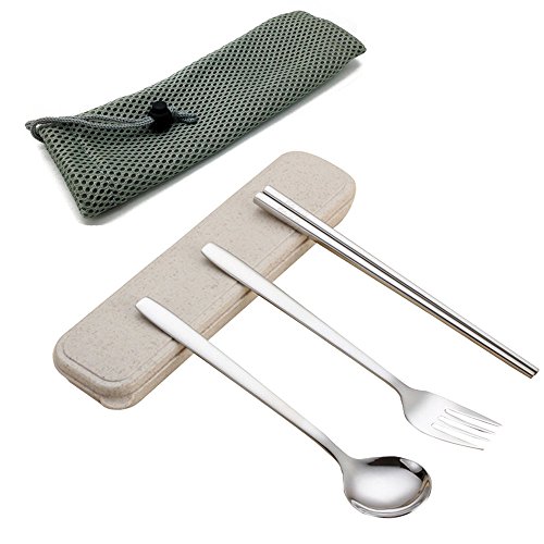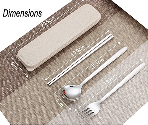 Chopsticks Spoon Fork Set Flatware Dinnerware Stainless Steel 304 with Travel Box and Bag for School Work Luch (Wheat color)