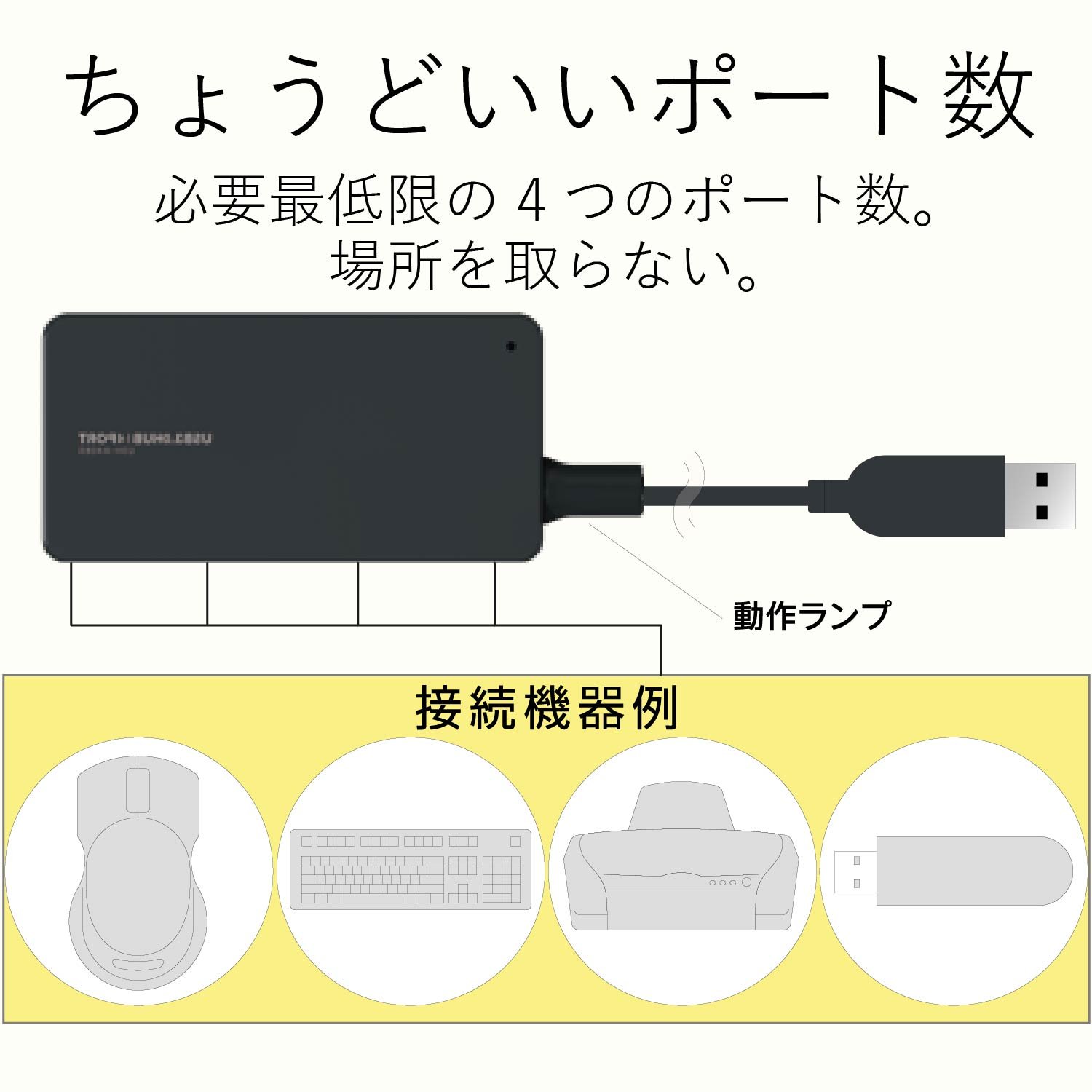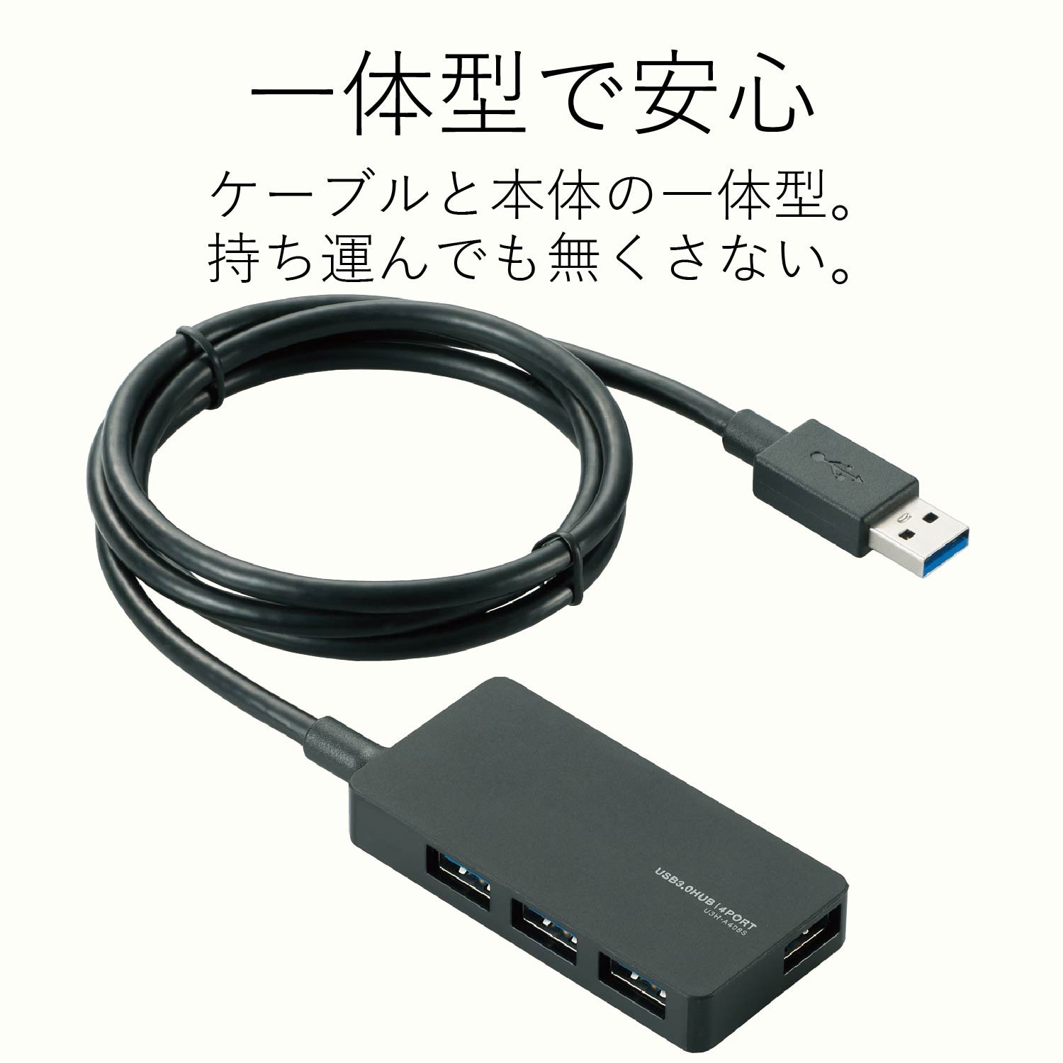 A 4-port USB hub with an AC adapter that supports USB 3.0 which realizes 10 times the transfer rate of USB 2.0, 5 Gbps (theoretical value).