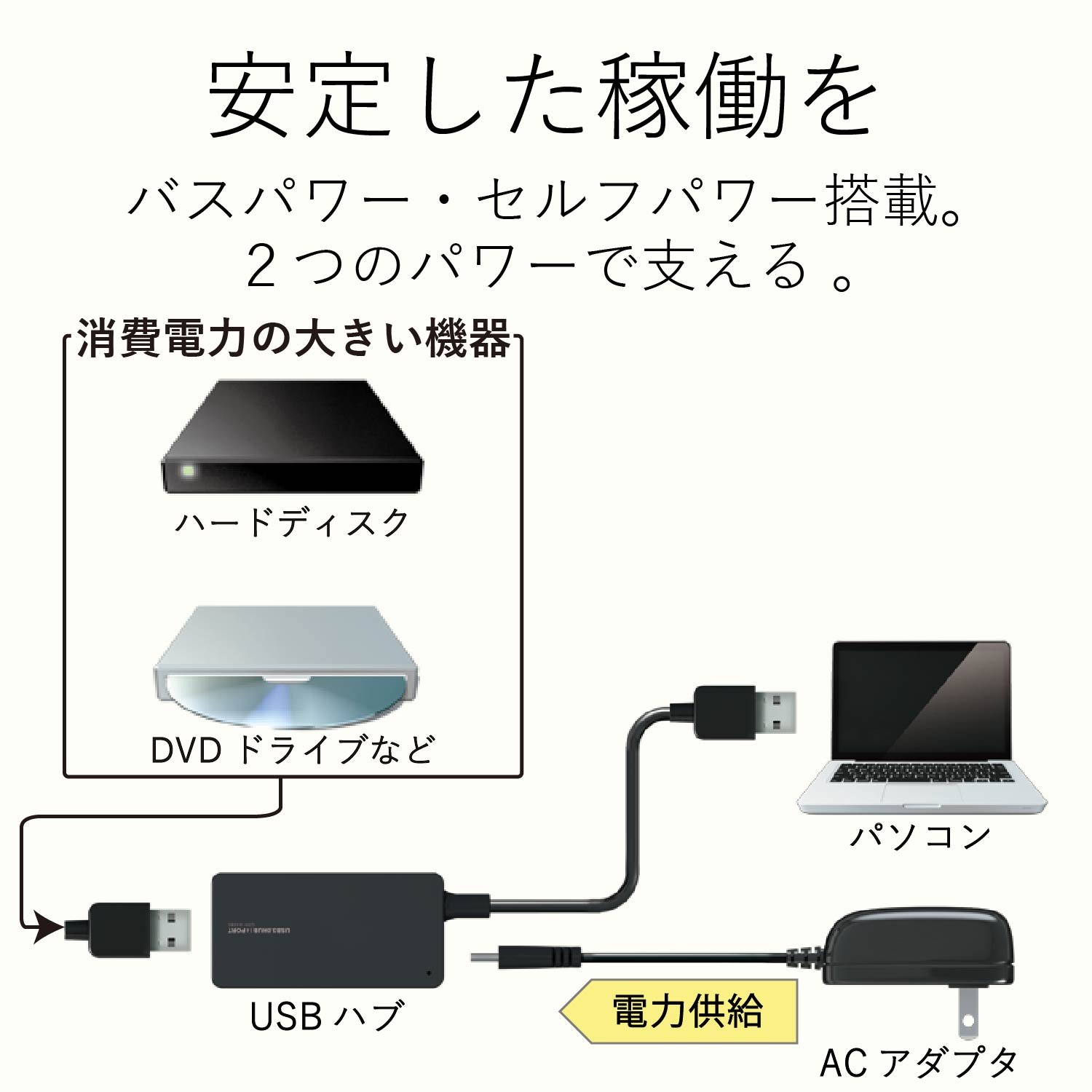 By connecting the included AC adapter and using it in the self-power mode, stable power supply is possible even when using a hard disk drive or DVD drive with high power consumption.