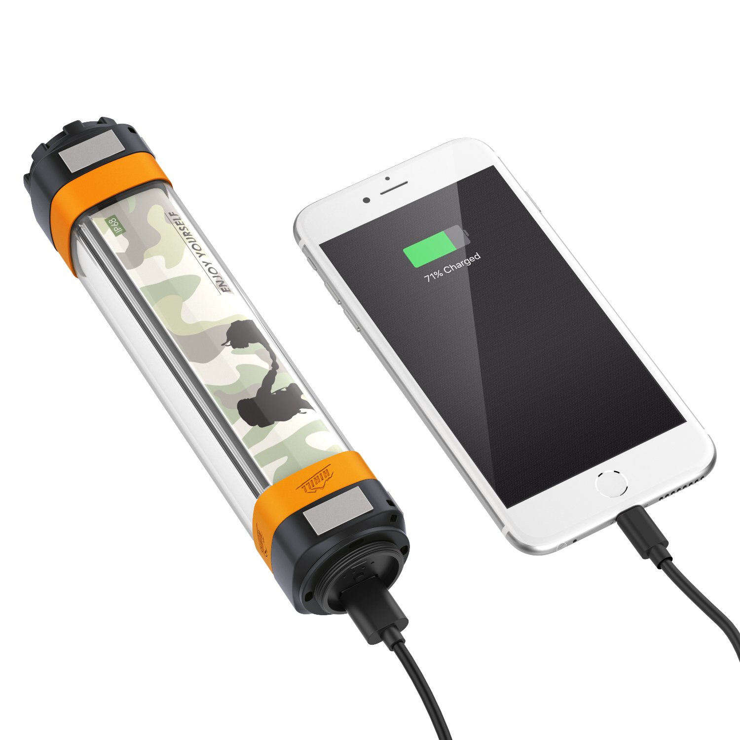 This product is a rechargeable camping light equipped with input and output USB charging port.