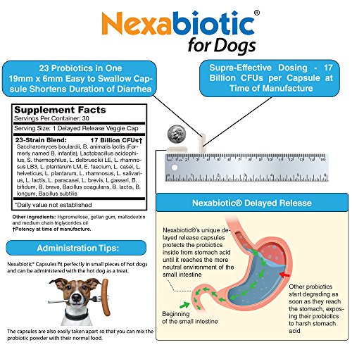 Nexabiotic® Probiotics for Dogs and Pippies contain a proprietary blend of 23 different probiotic strains. These include Saccharomyces boulardii, B. animalis lactis (formerly named B. infantis), Lactobacillus acidophilus, S. thermophilus, L. rhamnosus LB3, and L. brevis. These probiotics are clinically proven to support regular bowel movements and canine health. If your dog is suffering from diarrhea, then giving him or her a daily probiotic may help. Simply empty the capsule into your pet's food, mix, and feed.