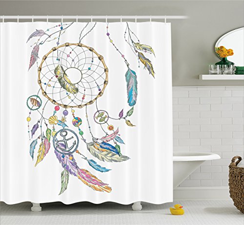Native American Decor Shower Curtain by Ambesonne, Ethnic Dreamcatcher with Marine Objects Shell Fish Anchor Boho Print Image, Fabric Bathroom Decor Set with Hooks, 70 Inches, Multi
