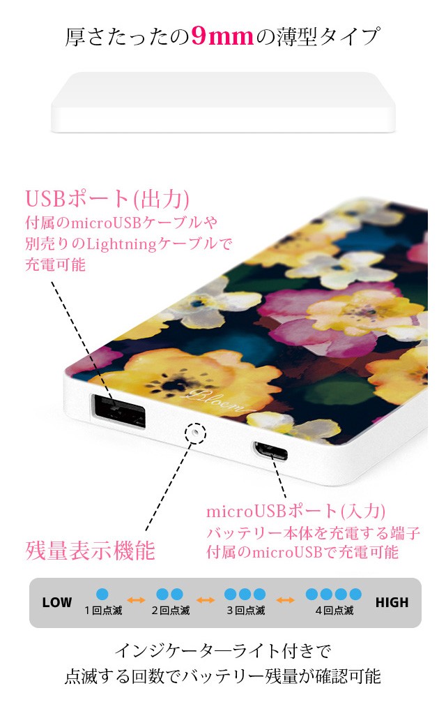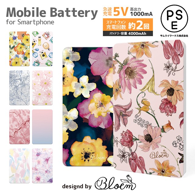 ■対応機種iPhoneシリーズAndroidシリーズその他、携帯ゲーム機や音楽プレイヤーなど■仕様[バッテリー容量]4000mAh[重量]103g[使用回数]約200回[入力電圧]5V[入力端子]microUSB[出力電圧]最大:5V 1000mA[出力端子]USB1口[寸法]縦111m × 横65mm × 厚さ9mm[付属品]microUSBケーブル 1個■バッテリーのプリントについて1点1点手作りの為、印刷が数mm程ずれる場合が御座います。また、お使いのブラウザや端末によっては、色味などの見え方が現物と異なる場合が御座います。■bloem ブルームおしゃれ かわいい 可愛い 女子 レディース 女の子 大人かわいい 大人女子 大人 エレガント おしゃれかわいい花柄 ピンク カラフル 香水 香水ボトル 香水瓶 コスメ 水彩大理石 マーブル 頑丈■その他モバイルバッテリー 4000mAh 軽量 極薄 コンパクト Bloem 花柄 コスメ パステル マーブル 全機種対応 iPhone [iPhoneX iPhone8 iPhone7 iPhone6S iPhoneSE iPhone5S iPhone6sPlus iPhone5c] Android スマホ スマートフォン アイフォン 大容量 充電器 携帯