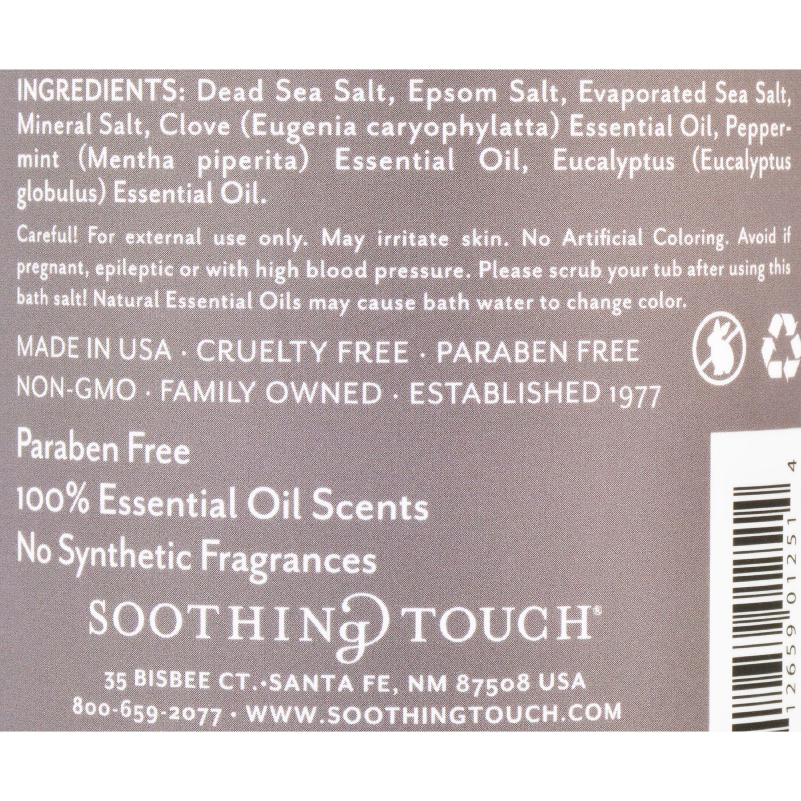 | This Bath Salt contains Dead Sea Salt, Evaporated Sea Salt, Mineral Salts, Epsom Salt and Essential Oils - Clove, Peppermint, Eucalyptus. This essential oil blend can be used for relief after strenuous exercise or just to ease muscle tensions. | |||
