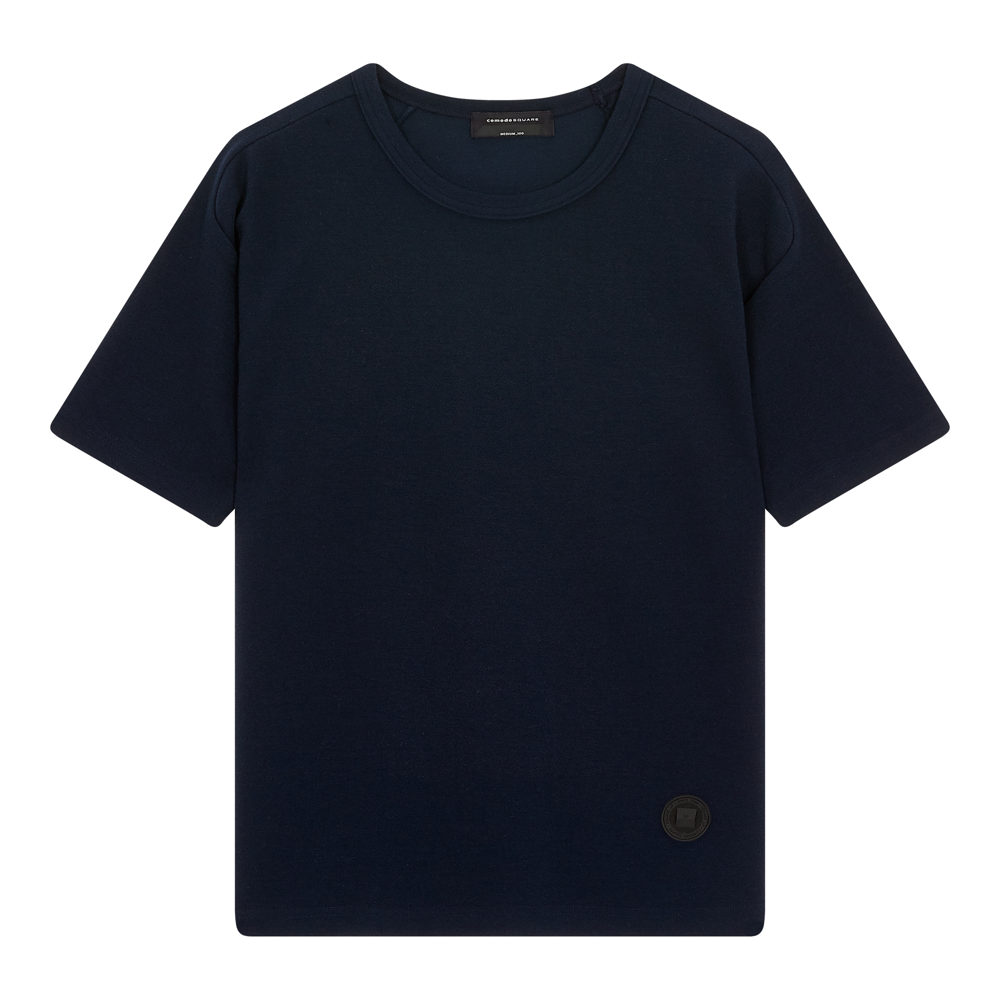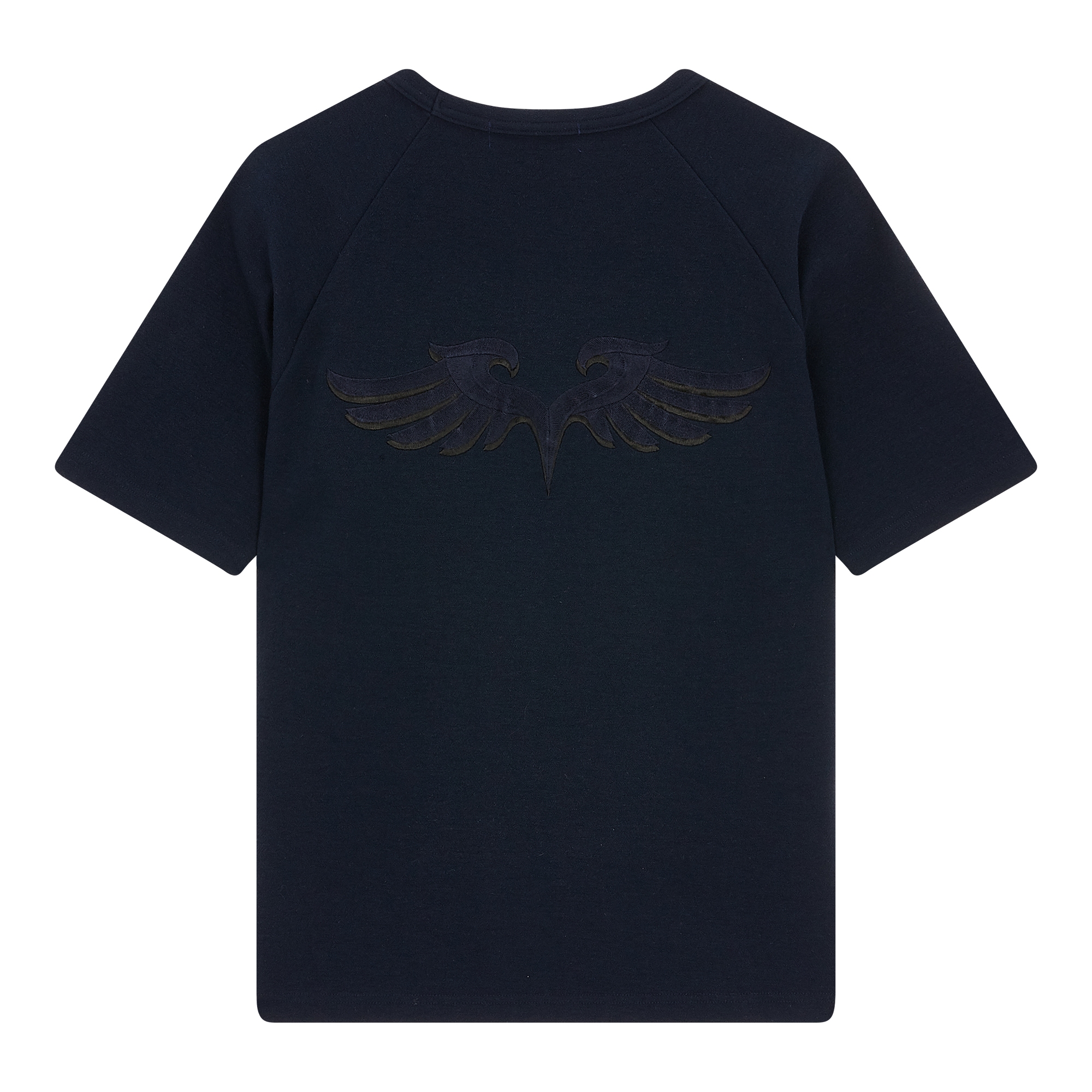 컬렉션 : 2018 Spring/Summer 디자인 포인트 : - 뒷면에 날개 모티브의 자수 디테일이 돋보이는 네이비 컬러 티셔츠- 라운드넥 디테일과 5부 슬리브를 가진 캐주얼한 디자인- 신축성 있는 소재로 편안한 착용감을 선사하는 아이템 스타일링 추천 : 다양한 워싱의 데님팬츠와 스니커즈를 매치하여 캐주얼한 스타일링을 연출 할 수 있음