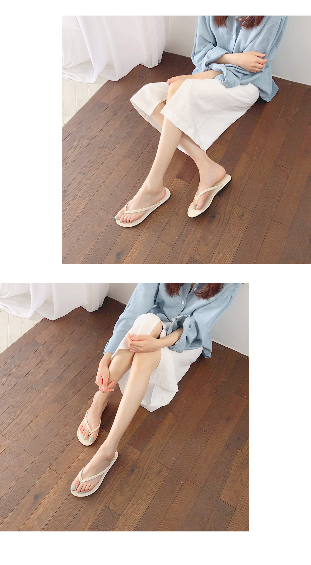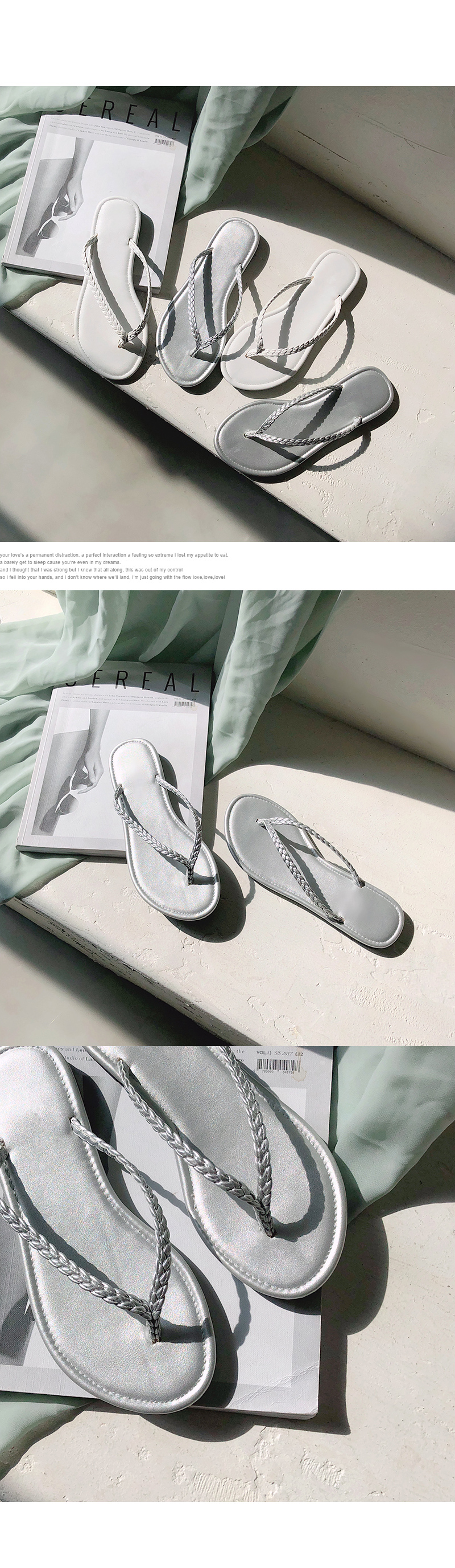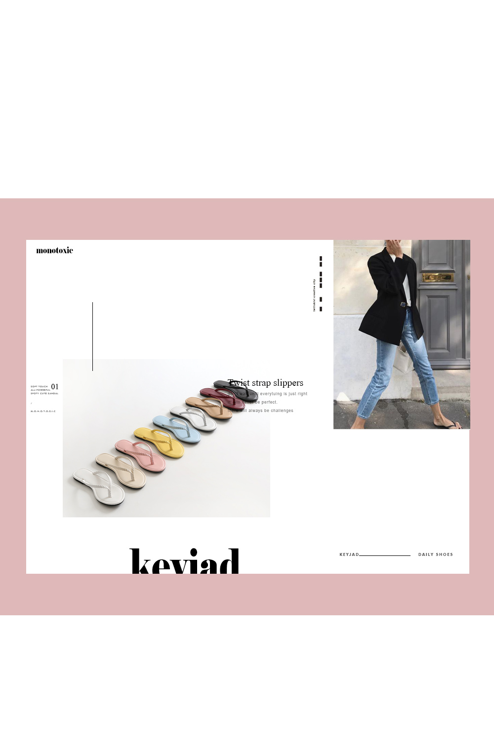 가장 스탠다드한 디자인의 쪼리디자인에 트위스트로 꼬아진 스트랩이 소소한 디테일이 되어줍니다.