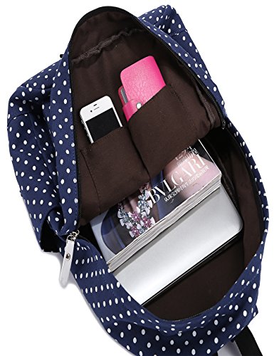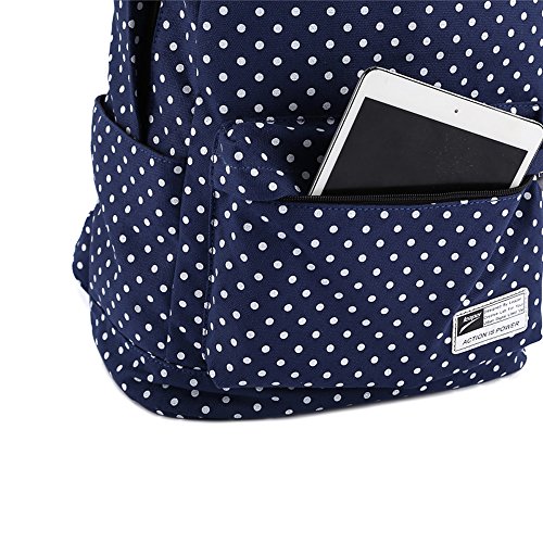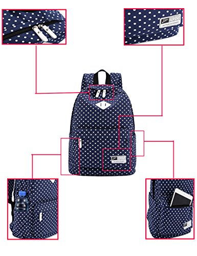 - Feature : Material: High quality and lightweight canvas / Size: 11*17*5.7in (L*H*W) / High volume Backpack with Polka Dots design in front side, side pockets and straps of the backpack / This bag can accommodate a 14-inch-computer / Unique design straps ease the pressure on the shoulder, and The cushion with high permeability material, have never cover the sweat when you carry it a long time.